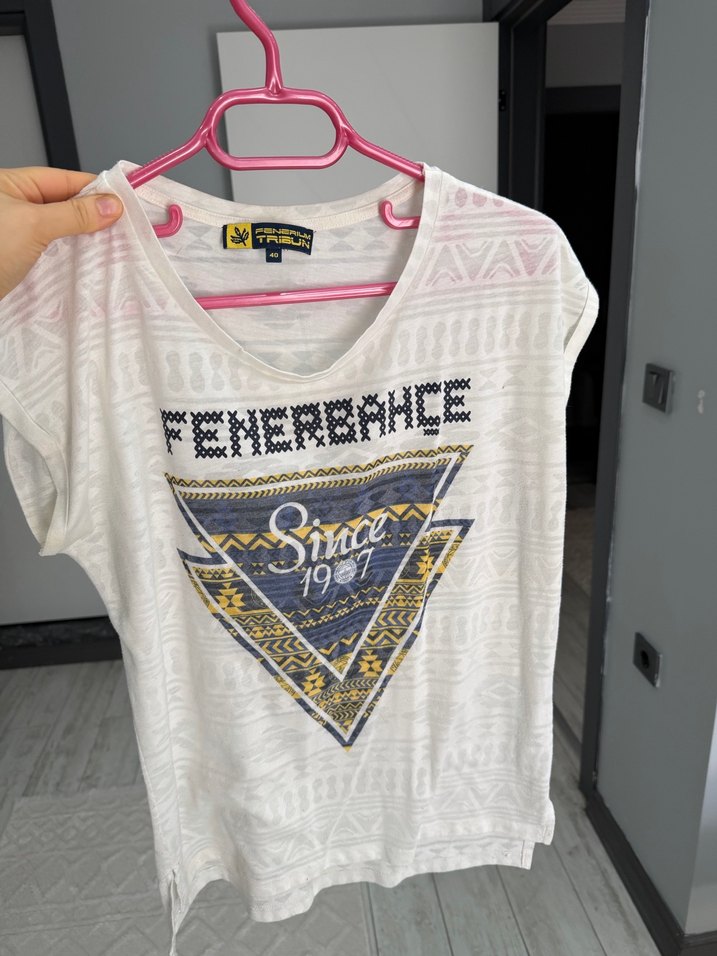 Beyaz kısa kollu, yuvarlak yakalı tişört, Fenerbahçe baskılı ve dantel detaylıdır. Gevşek kesim ve kısa boydadır, günlük kullanıma uygundur.