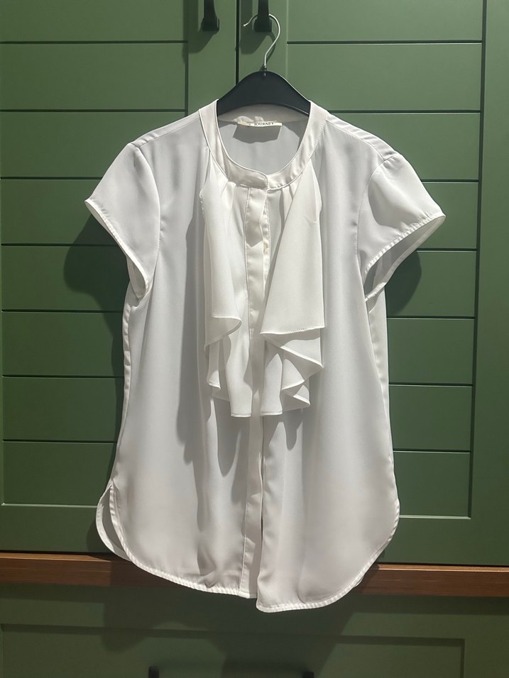 Beyaz, kısa kollu, yakalı, fırfırlı ve bol kesim kadın bluz. Hafif ve yumuşak keten kumaştan, ofis ve günlük kullanıma uygun.