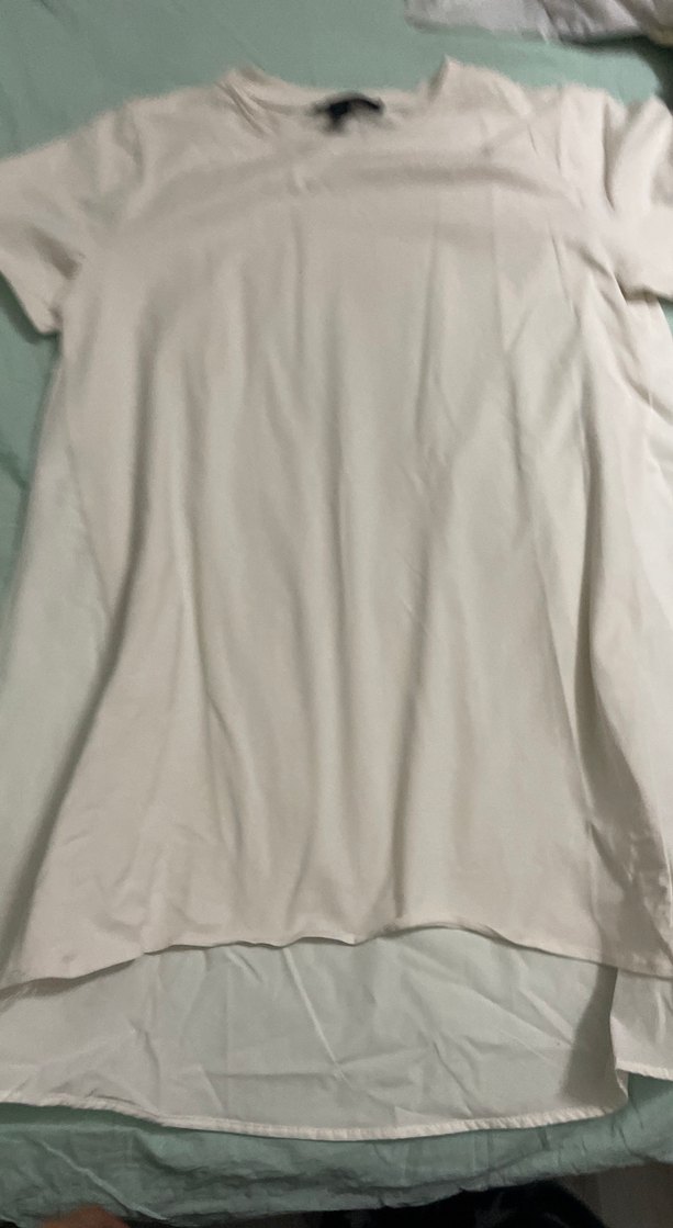 Yumuşak keten kumaştan beyaz kısa kollu hamile tişörtü, drapeli ve bol kesimli, yuvarlak yakalı. Günlük kullanıma uygun sade, minimalist stil.sifir etiketli