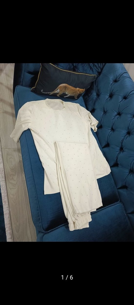 Kısa kollu, bisiklet yaka beyaz hamile pijama takımı. Üst ve midi boy pantolon hafif benekli desene sahip, rahat ve yumuşak kumaş içerir. osyo kumaş taşlı çok şık takim