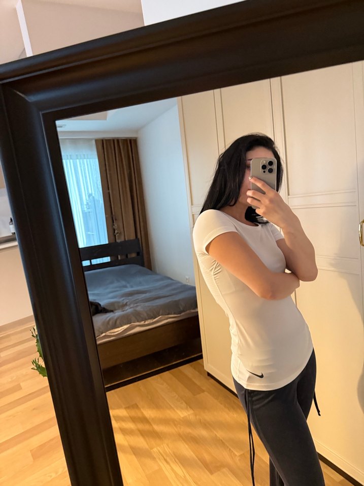 İnce kesim, düz yakalı ve kısa kollu beyaz hamile tişörtü, ipeksi kumaştan üretilmiş. Günlük kullanıma uygun, minimal ve şık görünümlü.