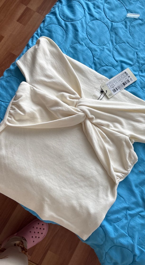 Pamuk kumaştan yapılmış, kısa kollu ve tekne yakalı beyaz kadın bluz. Baskılı desenli, vücuda oturan kesimiyle günlük rahat sokak stili için uygundur.