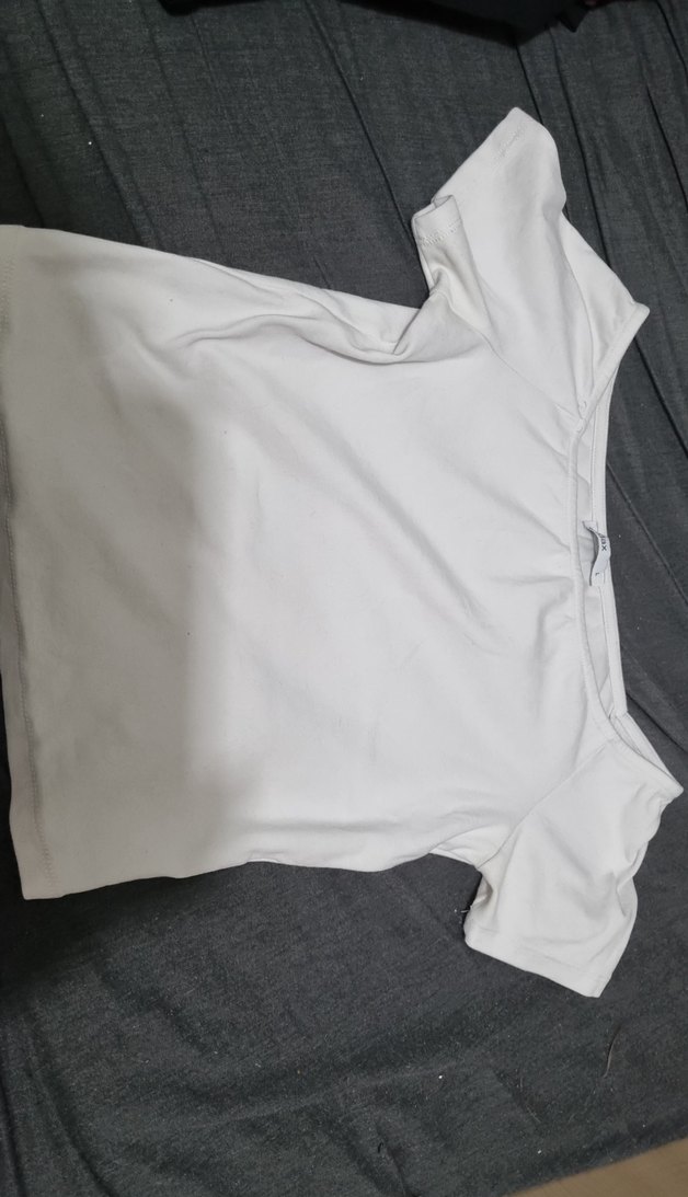 herhangi bir leke yoktur Beyaz renkli, kısa kollu ve tekne yaka kadın tişörtü, düz ve sade tasarıma sahiptir. Sentetik yumuşak kumaştan üretilmiş, günlük kullanım için uygundur.
