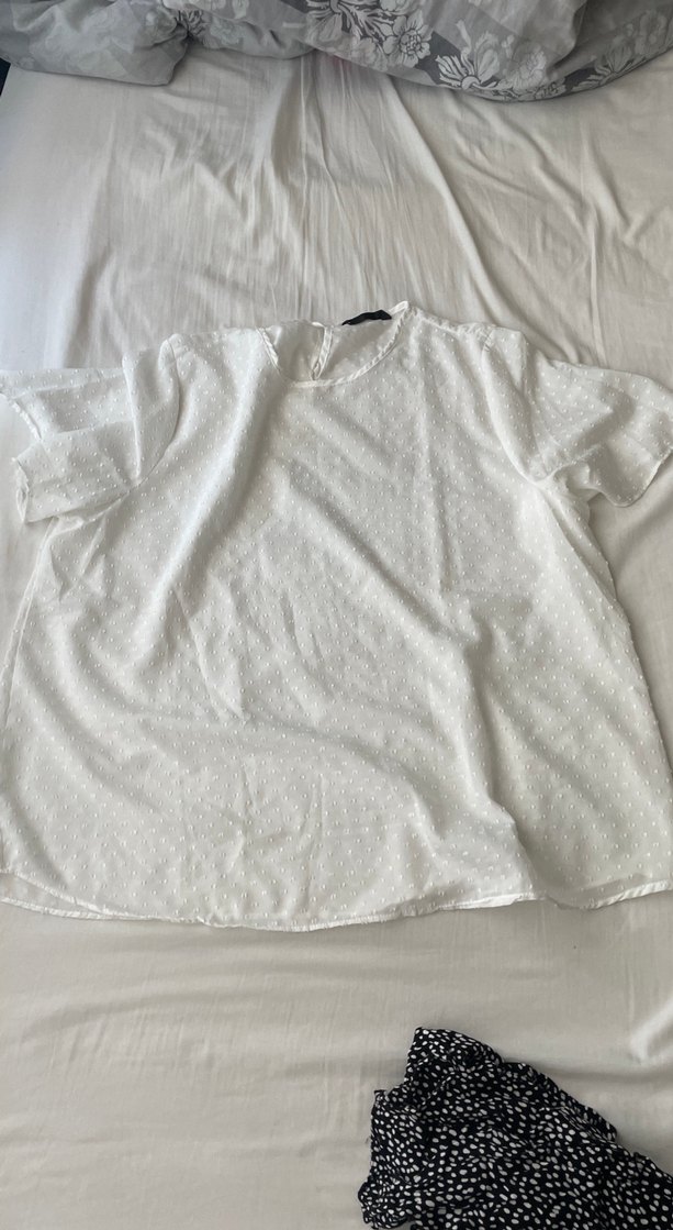 Beyaz, keten kumaştan kısa kollu, yuvarlak yakalı ve bol kesim bluz. Minimalist sokak stili için hafif noktalı dokulu tasarım. Transparan biraz ona göre içine giyilmesi lazım 3xl