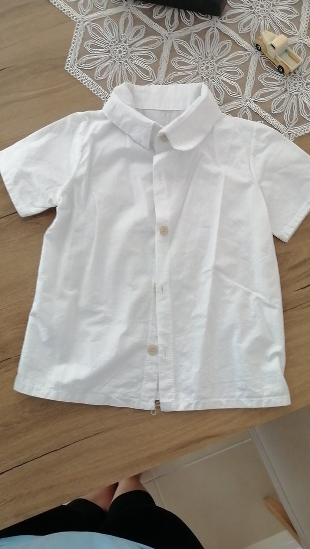 Beyaz renkli, kısa kollu, yakalı ve düğmeli erkek çocuk gömleği. Yumuşak keten kumaştan, regular fit ve sade sokak stiliyle.