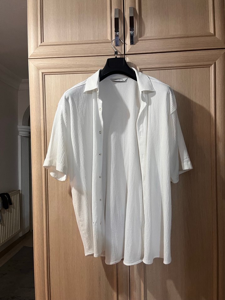 Beyaz renk, kısa kollu, keten kumaştan, pilili detaylı, yakalı ve midi uzunlukta bol kesim gömlek.