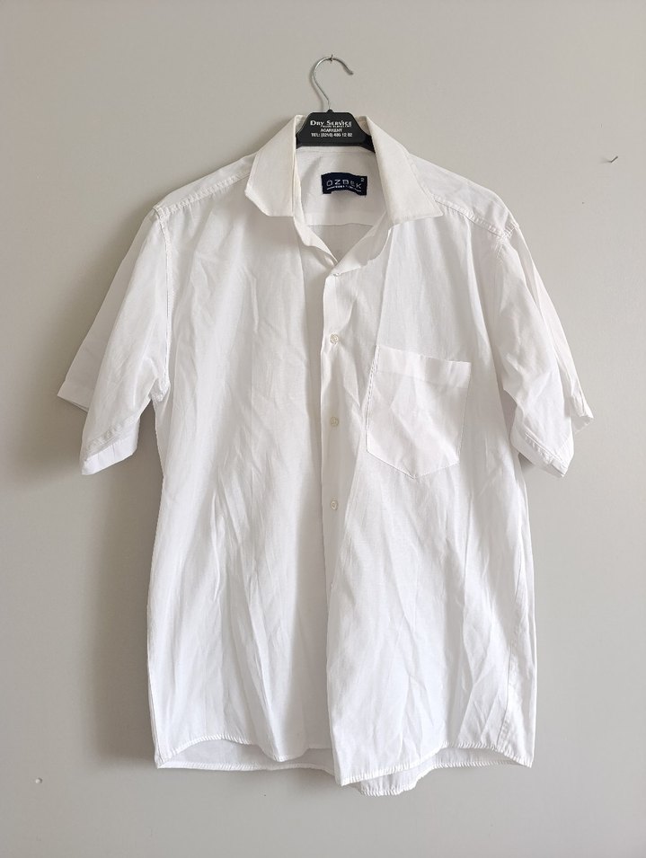 Geniş kesim, yakalı ve düğmeli beyaz keten gömlek. Göğüs cebine sahip, parlak kumaşıyla sokak stiline ferah bir dokunuş katıyor.