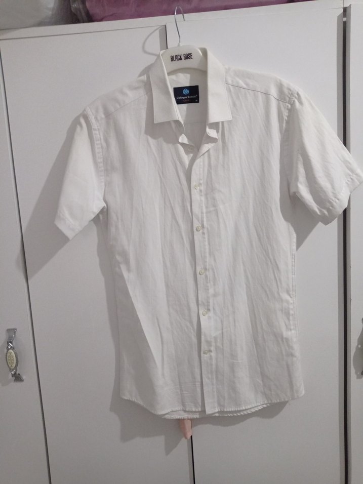 Beyaz kısa kollu keten gömlek, yakalı ve düğmeli, rahat kesimiyle gündelik ve ofis kullanımı için uygundur.