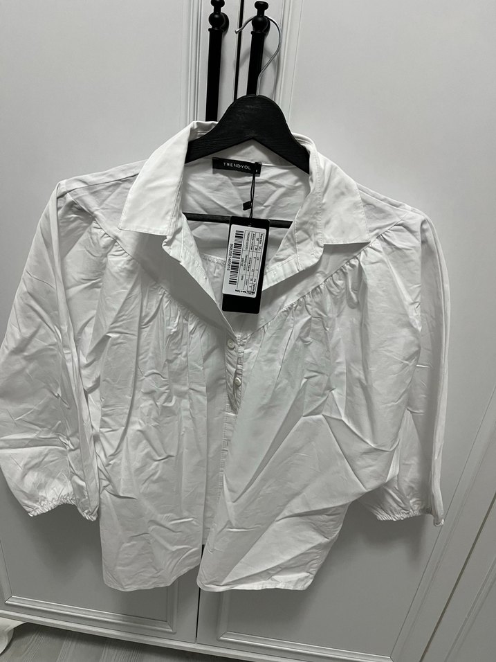 Beyaz keten kumaştan, kısa kollu, yakalı ve düğmeli rahat kesim bir gömlek. Normal midi boyda, günlük sokak stili için uygun.