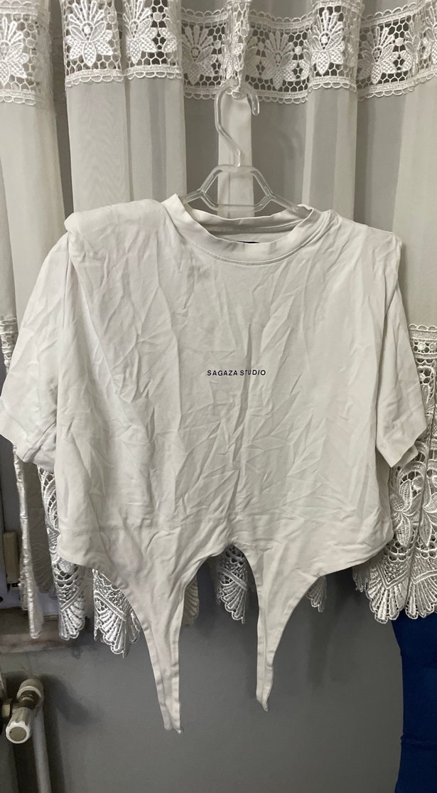 Beyaz kısa kollu keten tişört, bisiklet yaka ve bol kesim. Önünde "SAGAZAS" yazılı baskı bulunur. Günlük rahat sokak stiline uygun.