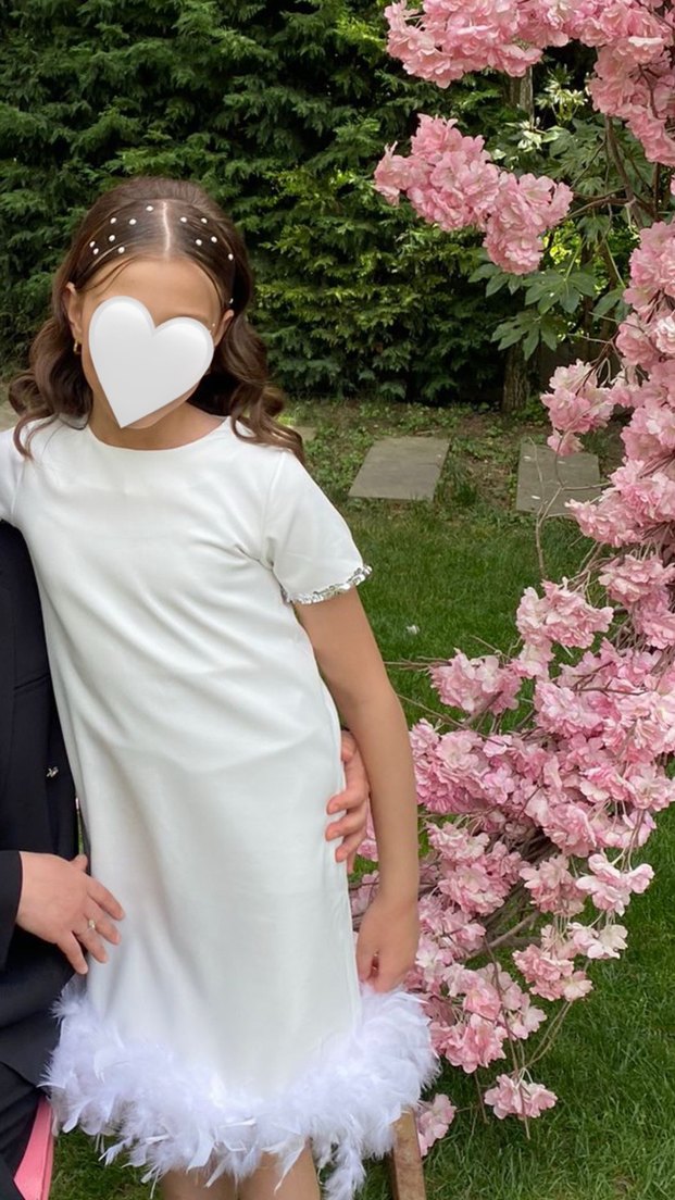 Kısa kollu, yuvarlak yaka ve fırfırlı detaylı, beyaz, vücuda oturan kız çocuk elbisesi. Bir defa giyildi