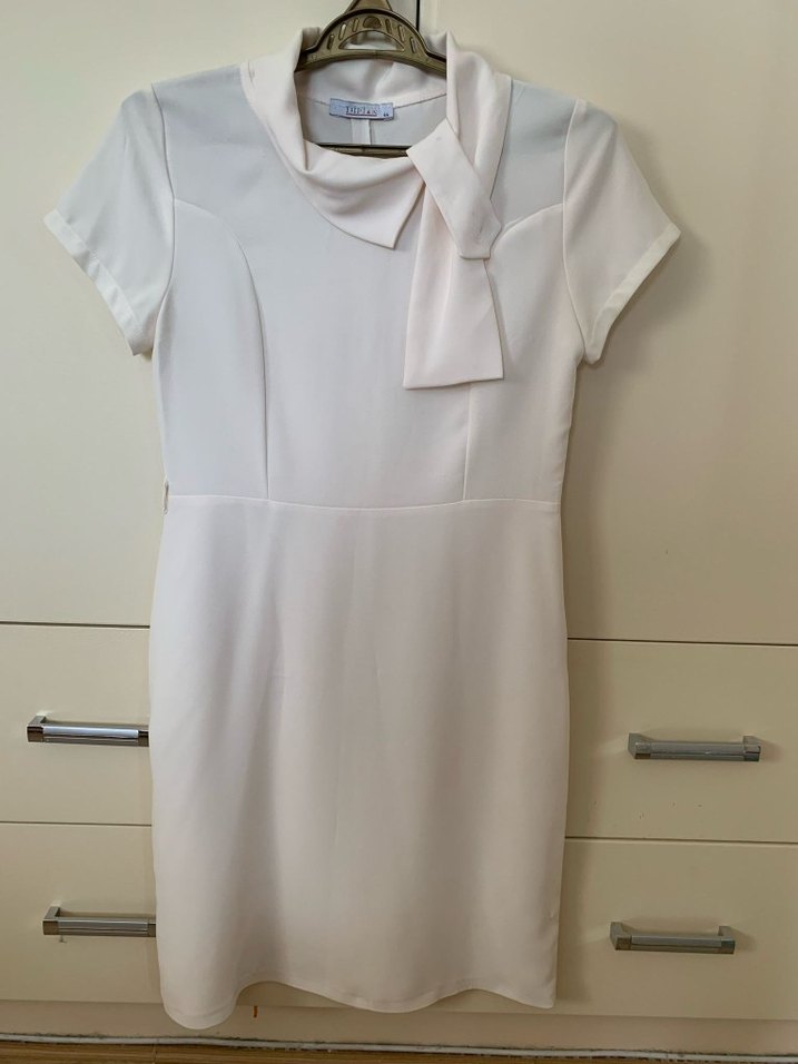 Beyaz midi elbise, kısa kollu ve yakasında bağlama detayı bulunur. Düz kesim ve modern klasik tarzda, ofis için uygundur.