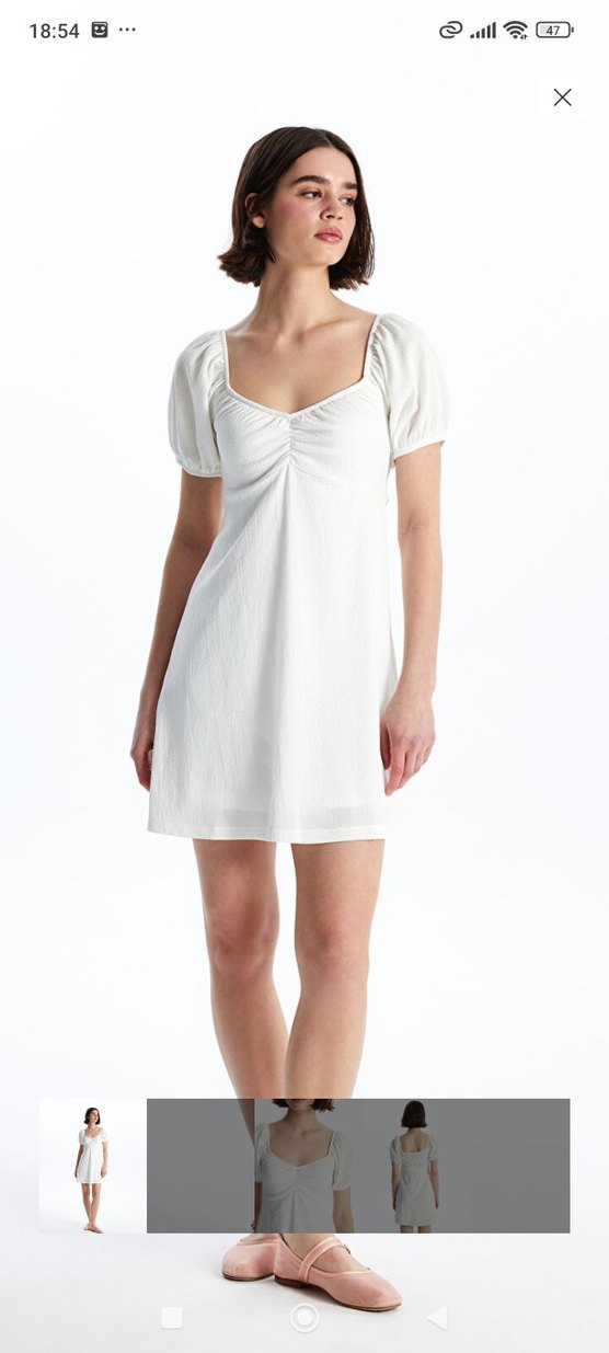 Beyaz midi elbise, kısa kabarık kollu ve drapeli V yaka detayına sahip. Yumuşak keten kumaştan, fit kesimle romantik buluşmalar için ideal.