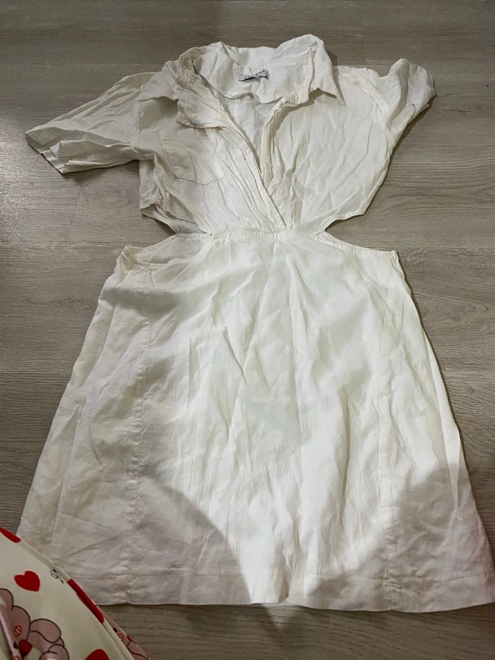 Beyaz midi uzunlukta, kısa kollu, keten kumaştan, drapeli ve V yakalı, beli oturan elbise. Minimalist ve bohem tarzda, günlük kullanım için uygun.