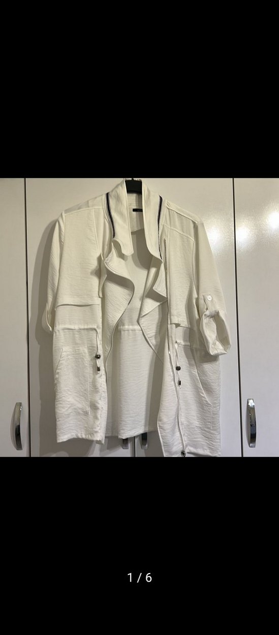 Beyaz renkli, kısa kollu, düğmeli ve keten kumaştan mini kadın ceket. Salaş kesimi ve çentikli yakasıyla gündelik sokak stiline uygun.EKOL CEKET