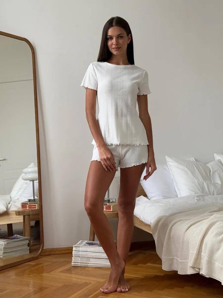 Minimalist tasarımlı, kısa kollu, bol kesim beyaz mini kadın pijama takımı, rahat geceler için ideal.