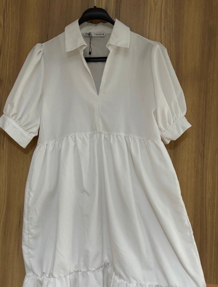 Beyaz mini elbise, kısa kollu ve V yakalıdır. Yumuşak keten kumaştan yapılmış, düğmeli ve rahat bohem tarzındadır. Günlük kullanıma uygundur.