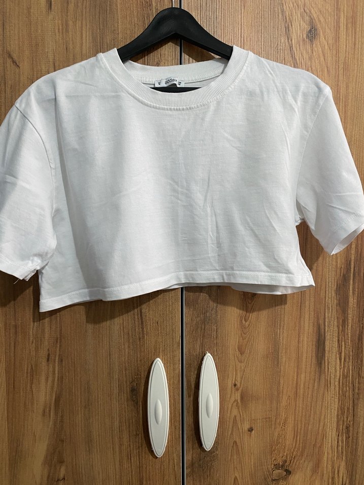 Pamuk kumaştan, yuvarlak yakalı, bol kesim beyaz kısa kollu mini tişört. Minimalist sokak stili için uygun. M beden hiç kullanılmadı bir sorun yoktur.