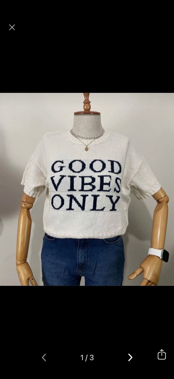 Beyaz kısa kollu, örgü kadın kazak. Bol kesim ve bisiklet yaka ile rahat bir kullanım sunar. "GOOD VIBES ONLY" baskısı ile günlük sokak stiline uygundur. ☁️