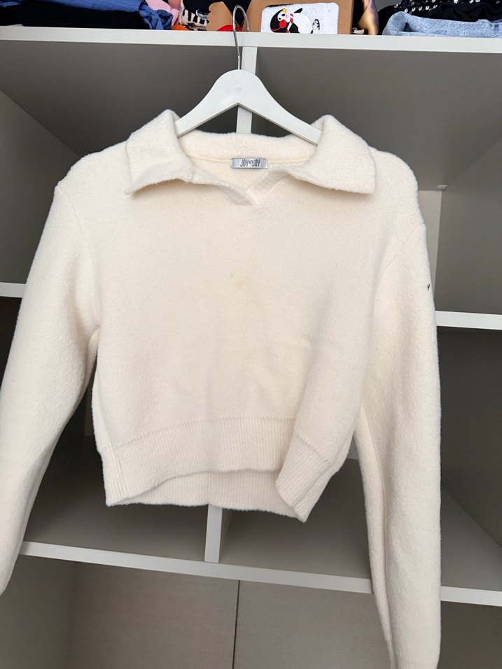 Beyaz renkli, kısa boy örgü kadın kazak, yaka detaylı ve uzun kolludur. Yumuşak ve sıcak kumaştan üretilmiş, bol kesimdir, günlük sokak stili için uygundur. Hiç giyilmedi peluş