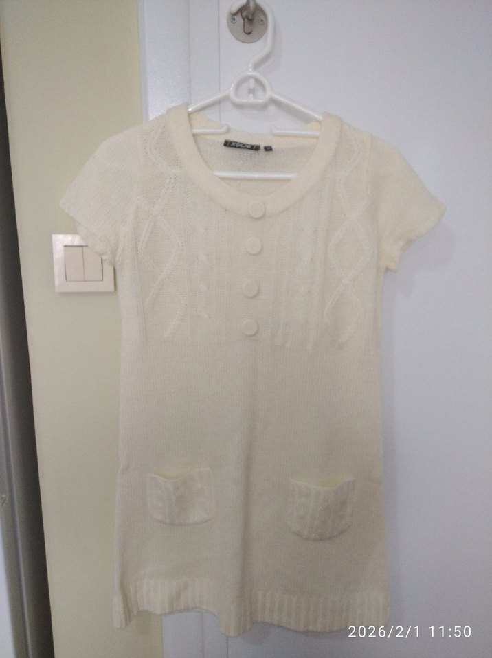 Beyaz renkli, kısa kollu, yuvarlak yaka, örgü triko elbise. Midi boyda, iki ön cepli, sade ve rahat bir tasarıma sahiptir.