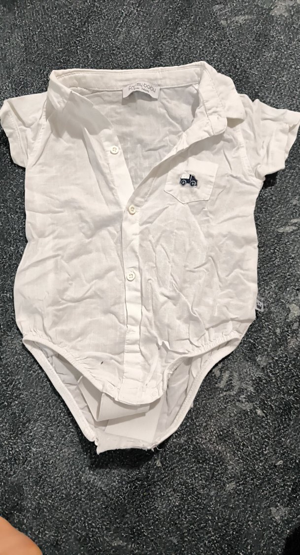 Yumuşak pamuktan yapılmış beyaz kısa kollu bebek body, yakalı ve düğmeli. Göğüs cebinde küçük nakış detayı bulunur. oğlum uzun süre giysin diye lastikli uzatma yapmıştım sökülebilir sıkıntı yok