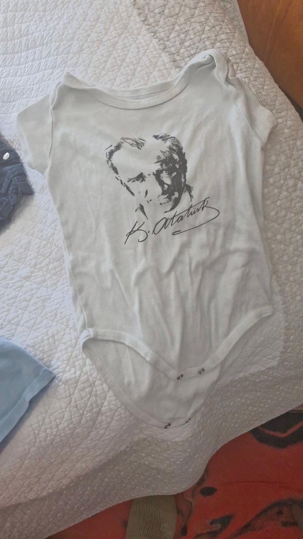 Beyaz, kısa kollu, pamuklu bebek body. Yuvarlak yaka ve baskılı deseni var. Çıtçıtlı kapama ve sokak giyimi tarzında.
