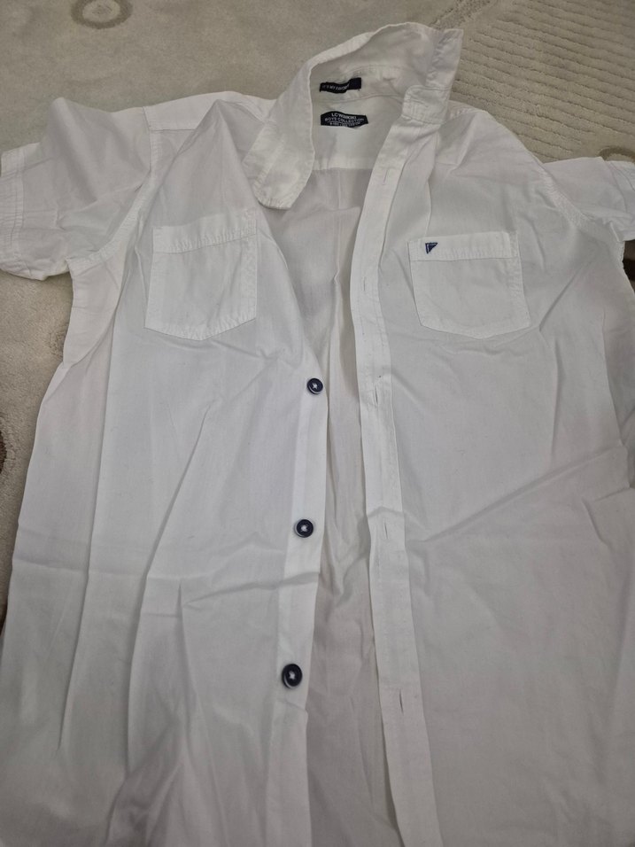Erkek çocuk beyaz gömlek, kısa kollu ve yakalıdır. Pamuklu kumaştan üretilmiş, düğmeli ve rahat kesimdir. Günlük ve sokak stili için uygundur.