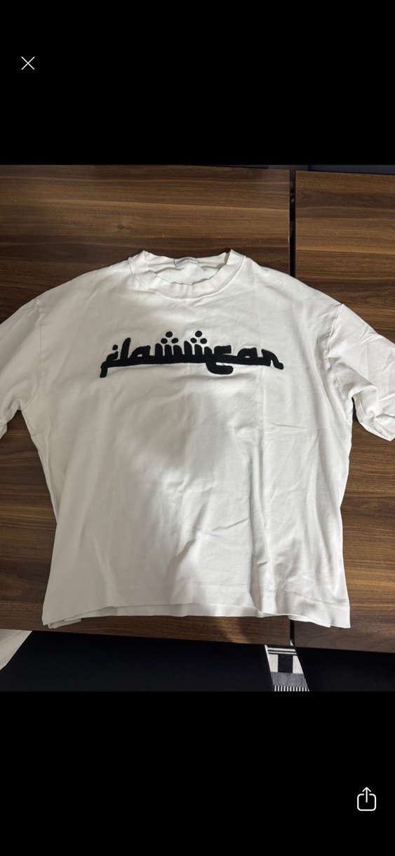 Beyaz renkli, pamuklu kumaştan yapılmış, kısa kollu ve yuvarlak yaka kadın tişörtü. Önünde koyu renk baskı bulunur, rahat ve sade bir görünüme sahiptir.