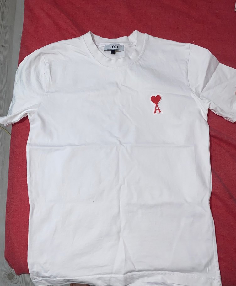 Kısa kollu, bisiklet yaka, pamuklu beyaz tişört. Göğüste küçük kırmızı kalp baskısı ile sade ve şık, rahat kesim.