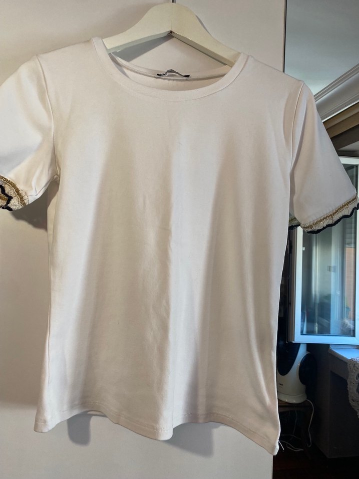 Beyaz pamuklu tişört, kısa kollu ve yakası yuvarlak. Dökümlü kesimiyle rahat ve gündelik sokak tarzına uygun.