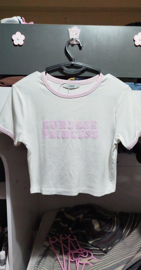 Beyaz pamuklu tişört, kısa kollu ve bisiklet yaka. Önünde pastel pembe "SUNDAY PRINCESS" baskısı ve aynı renkte kenar detayları bulunur. Rahat ve şık bir sokak stili için uygundur. açık lila pastel renkli yazıya ve çizgilere sahiptir. ürünü Sadece bir kez giydim. fotoğrafını ütüsüzken çektim. yeni bir ürün yani sadece ütüye ihtiyacı vardır.