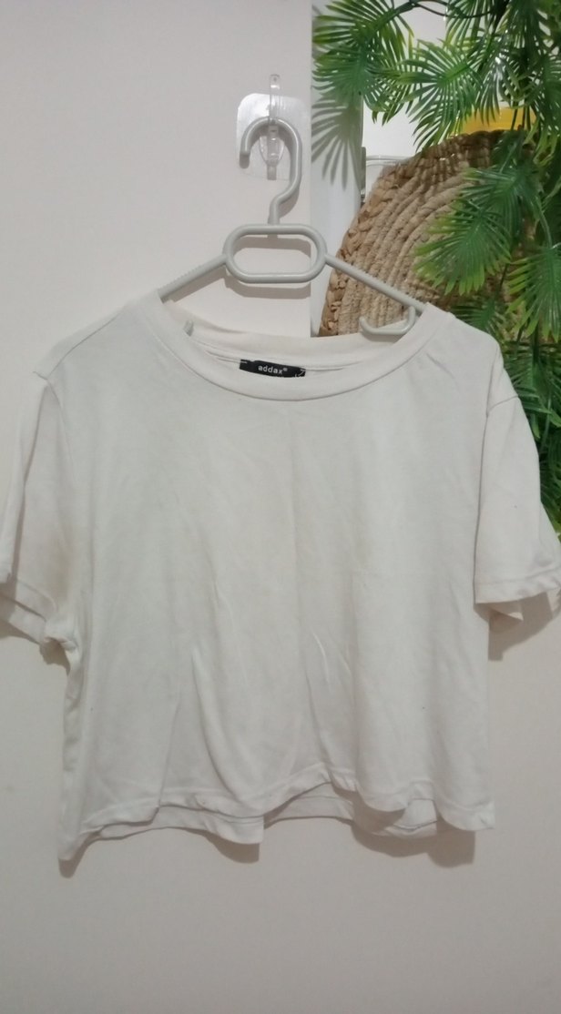 Beyaz pamuklu tişört, yuvarlak yaka ve kısa kollu, bol kesim ve normal boyda, minimalist ve sade tarz sunar.