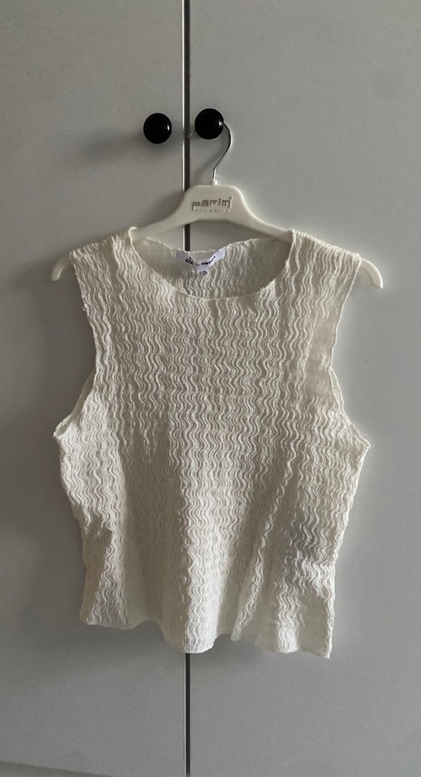 Beyaz Kısa Kollu Pliseli Keten Kadın Tişört