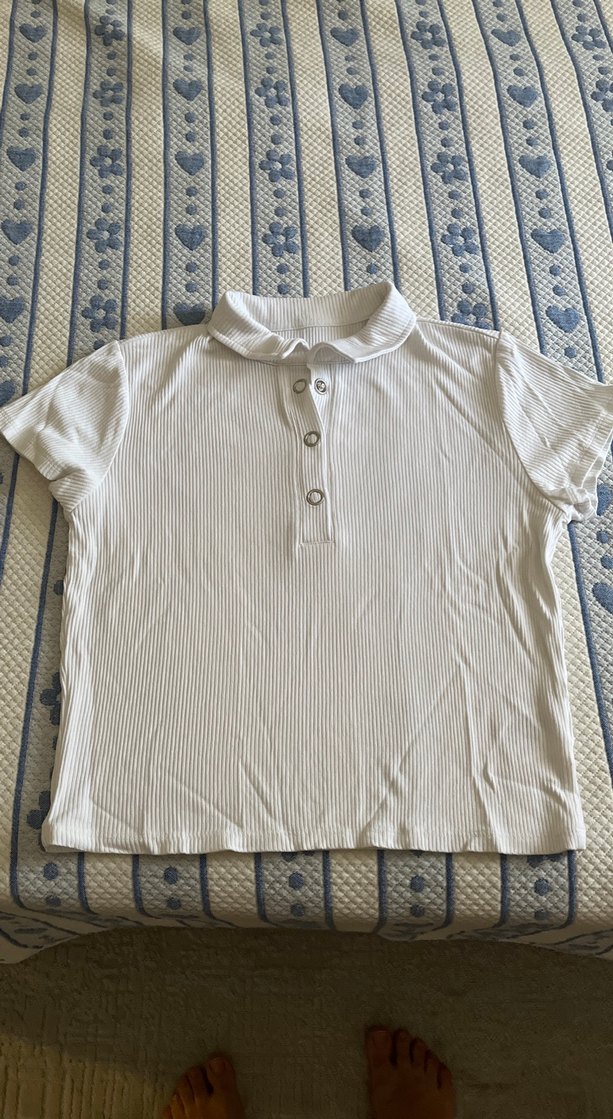 Kısa kollu, düğmeli, yakalı ve pamuklu kumaştan yapılmış beyaz renkli fitted polo tişört.