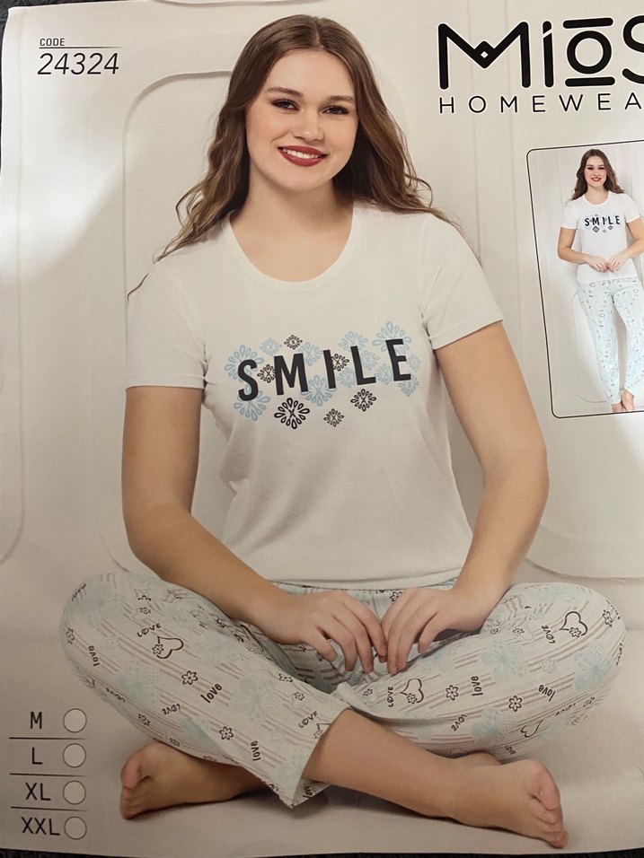 Kadınlar için beyaz, kısa kollu ve bol kesim pijama takımı. Üstte pastel renkli 'SMILE' baskısı ve rahat desenli kısa pantolon bulunur.