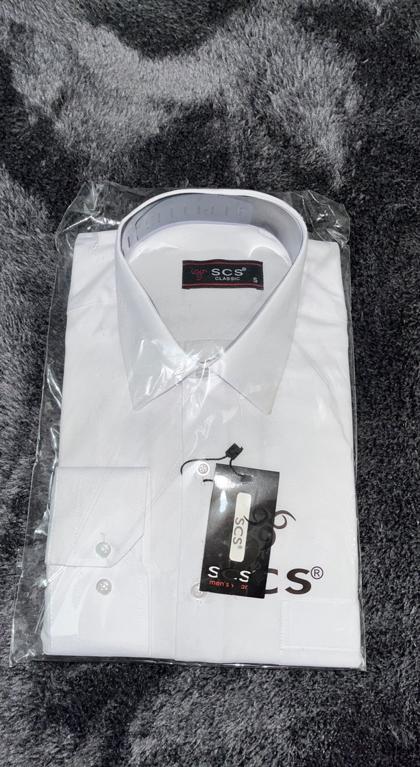 Beyaz, kısa kollu, yakalı ve düğmeli erkek gömleği. Parlak sentetik kumaştan, normal boyda ve baskılı desene sahip. Ofis ve sokak stili için uygundur. SCS markalı.