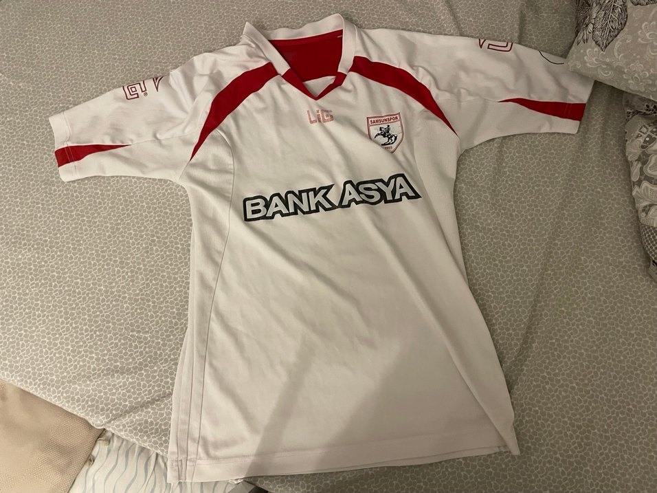 Beyaz, kısa kollu, dar kesim spor forma, bisiklet yakalı ve düğmeli detaylı. BANKASYA baskılı, sentetik kumaştan, athleisure ve sokak stiline uygun. ⚽