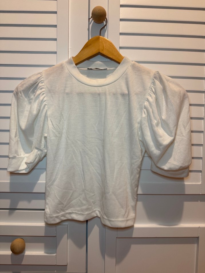 Bayan kısa ve balon kollu, yuvarlak yaka ve keten kumaştan üretilmiş beyaz tişört. Rahat kesimi ve sade tasarımıyla trend sokak modasına uygundur. Boy 40 cm en 30 cm ✨