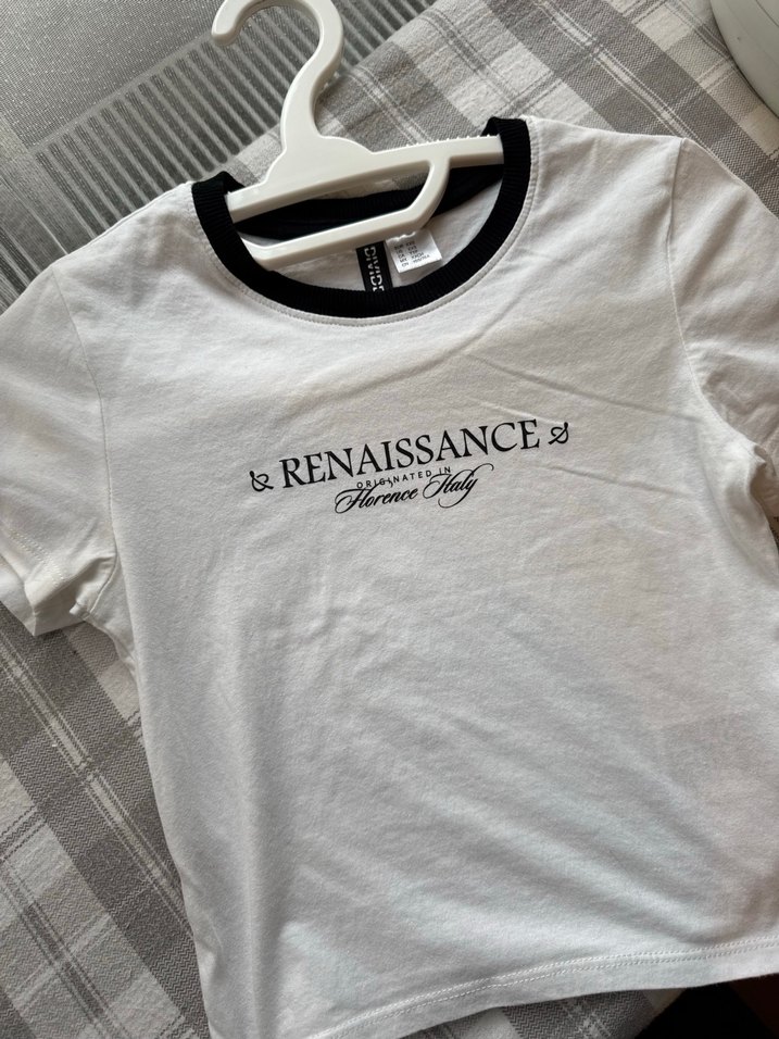 Fitted kesim, kısa kollu, yakası gri detaylı beyaz tişörtü. Önünde "RENAISSANCE" baskısı bulunan, sentetik kumaştan rahat bir model. ✨
