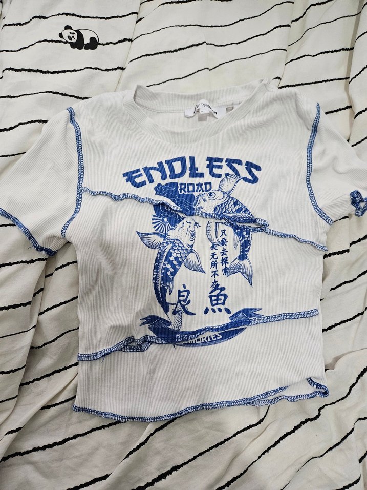 Koton marka. S beden. İki küçük dekoltesi var. Üstünde çince yazılar var. Ters dikiş detayları var. Hiç giyilmedi. Sorunsuz.