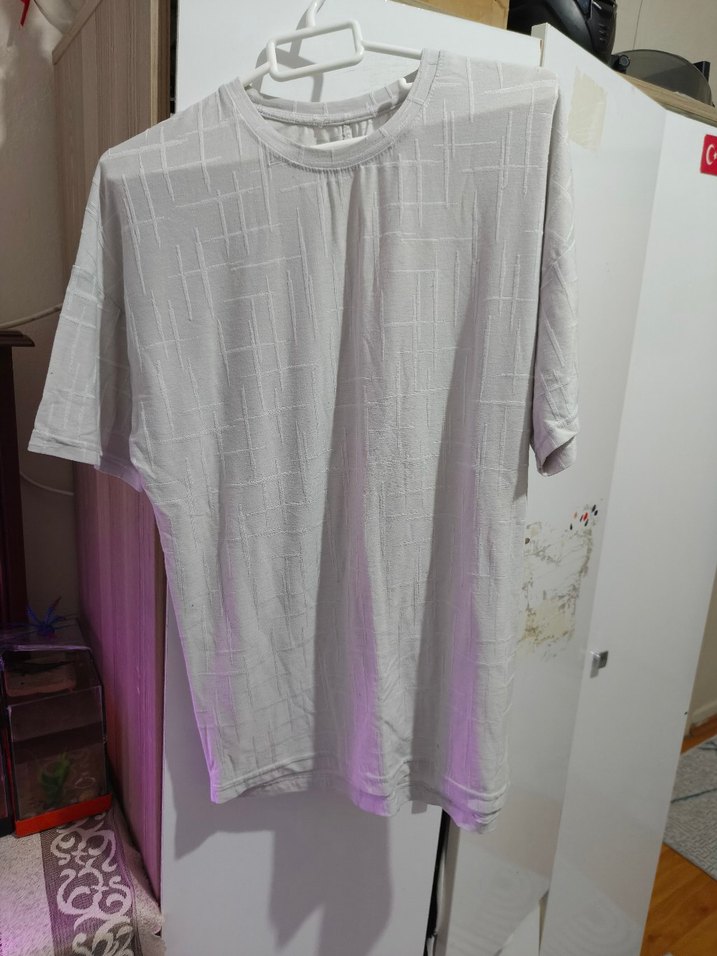 Beyaz , gevşek kesim ve yuvarlak yaka kısa kollu tişört. Minimalist sokak stili için hafif dokulu desene sahip.