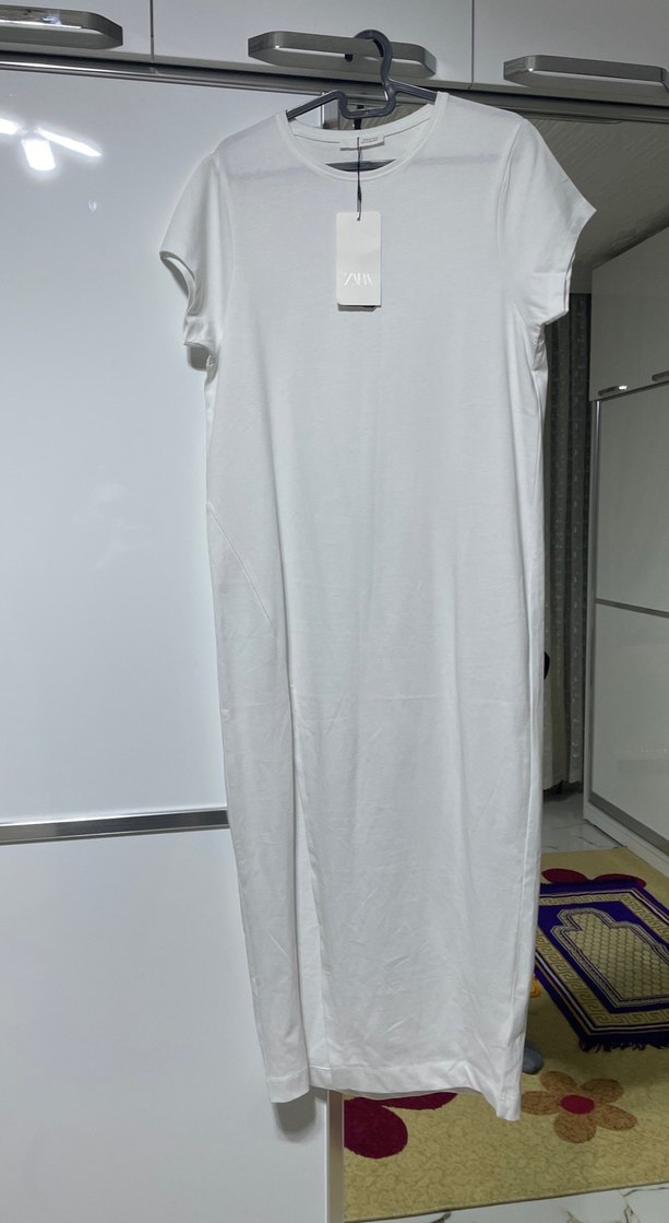Pamuklu kumaştan, kısa kollu, yuvarlak yakalı ve bol kesim beyaz uzun elbise. Minimalist tasarımıyla günlük kullanım için zahmetsiz şıklık sunar. sıfır ürün.