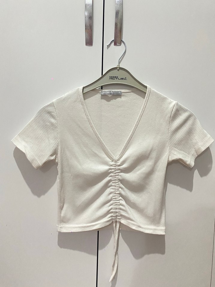 v yaka ve pileli detaylı beyaz kısa kollu crop top, dar kesim ve rahat sokak stili için uygun.
