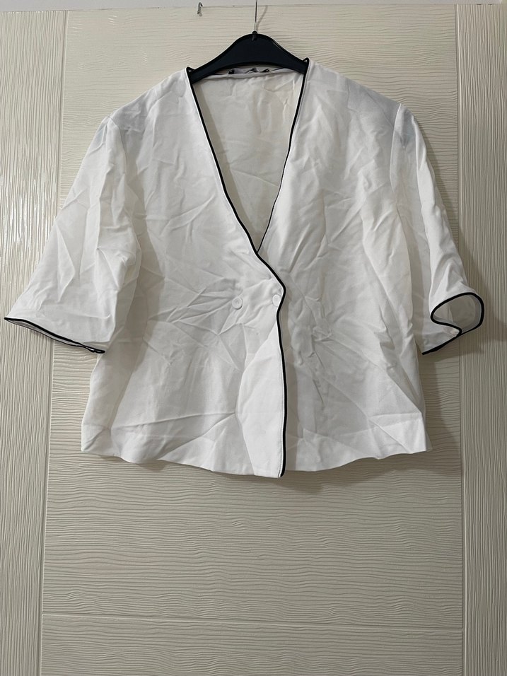V yaka, düğmeli beyaz gömlek, kısa kollu ve bol kesim. Kenarlarında siyah şerit detayları bulunur, günlük sokak stili için uygundur.