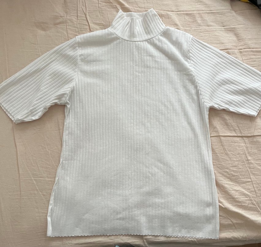 Yüksek yakalı ve kısa kollu, beyaz tişört. Yumuşak keten kumaştan, düz ve rahat günlük kullanım için uygun.