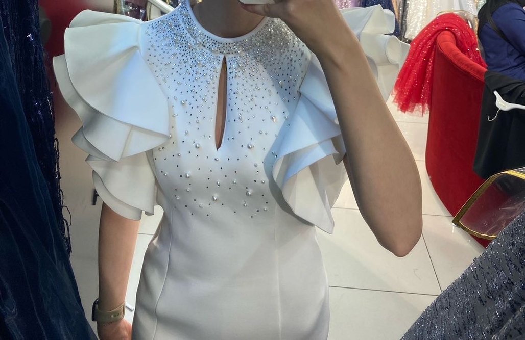 V yaka, kısa volanlı kollu, payet ve nakış detaylı beyaz kısa abiye elbise. ✨