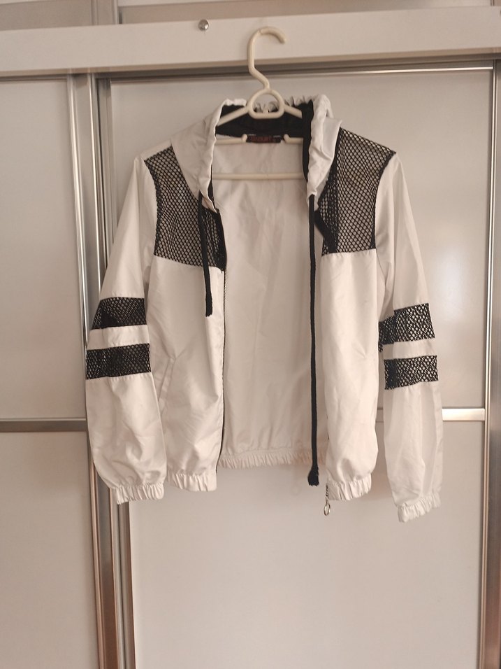beyaz kadın eşofman üstü.Yüksek yakalı, omuz ve kollarda siyah file detaylı, viskon kumaştan üretilmiştir. ufacık pekde görünmeyen bir lekesi var