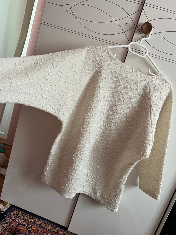 Beyaz renkli, yuvarlak yakalı ve uzun kollu kısa kesim triko kadın kazak. Rahat ve sade tasarımıyla günlük kullanıma uygundur.