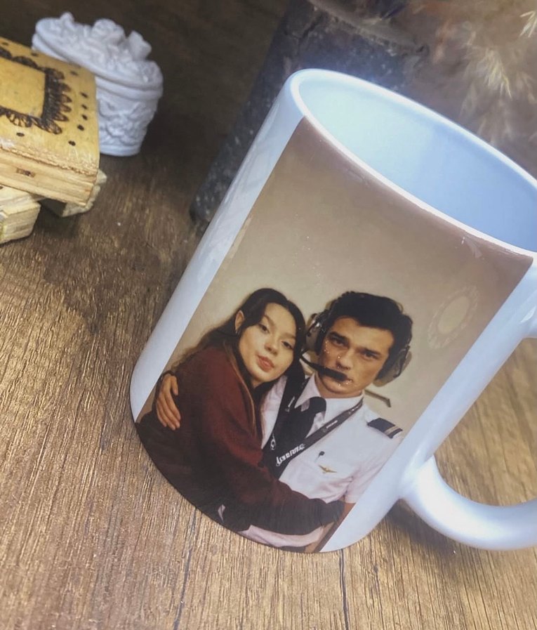 Beyaz seramik kupa, üzerinde çiftin sarıldığı kişiye özel fotoğraf baskısı bulunur. Parlak yüzey ve rahat kulpludur. ☕